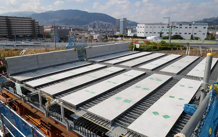 既設RC床版を鋼床版に取り替える工法です。腹板を介して鋼床版の荷重を支持することにより、時間のかかる、上フランジ上のコンクリート撤去作業が省略でき、急速施工が可能となります。